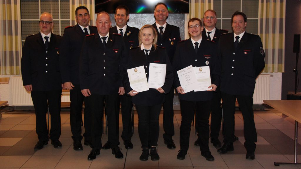 Thorsten Rose, stellvertretender Leiter der Feuerwehr Rüthen, blickte nicht nur auf die Herausforderungen der Gesamtwehr, sondern hatte auch Beförderungen und Teilnahmebescheinigungen im Gepäck: Linus Fredebeul darf sich jetzt Oberfeuerwehrmann nennen, Carsten Kroll hat einen Lehrgang zu Vegetationsbrandbekämpfung absolviert, Jonas Trost hat am Truppführerlehrgang F2 teilgenommen und Catharina Gockel am Atemschutzgeräteträgerlehrgang. Bei den Leistungsnachweisen wurden Jonas Trost und Catharina Gockel für ihre fünfte Teilnahme mit dem Leistungsabzeichen in Gold ausgezeichnet, Matthias Kroll für seine 35. Teilnahme mit dem Leistungsabzeichen in Gold 35 und Linus Fredebeul für seine erste Teilnahme mit Bronze. “Mich freut das immer, dass ihr so mannstark an den Leistungsnachweisen teilnehmt”, sagte Thorsten Rose.