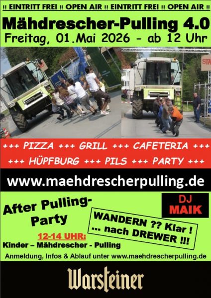 Drewer – Am 1. Mai ist es wieder so weit: In Drewer findet das Mähdrescherpulling 4.0 statt. Teams aus der Region treten gegeneinander an, um gemeinsam einen rund 13 Tonnen schweren Mähdrescher über eine 30 Meter lange Strecke zu ziehen. Dabei sind nicht nur Muskelkraft, sondern vor allem Teamarbeit, Ausdauer und Fair Play gefragt.